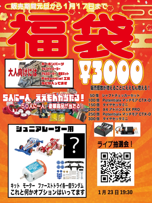 今年もやります! 福袋! racers尼崎店での店頭販売はございません。 福袋には3000円分以上のミニ四駆に使えるアイテムが入ってます。 さらに 抽選で5個に1つなんかえーもん当たります。 2枚目以降の写で随時追加 そして 50個に1つめっちゃえーもん当たります。 抽選はライブ配信で行います。 ジュニア用 このアイテムは絶対入ってます。 キット1+ファーストトライ+モーター さらに1つオプションパーツ タイヤセッターミニは次期生産予定は完全に未定です。 ライブ配信を見逃しても こちらで当選結果は発表いたします。