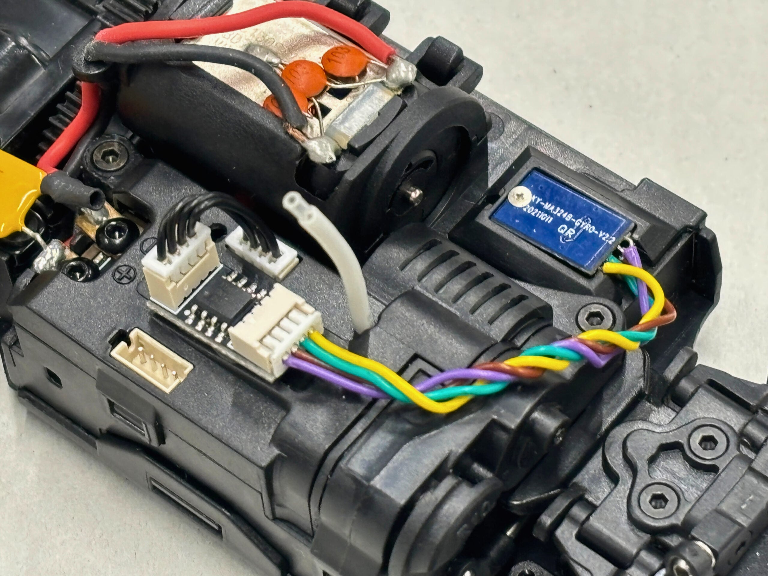 KYOSHO純正のジャイロセンサーとレシーバーアンプユニットの間に装着することで純正ジャイロの信号を補正しMRDのドリフト走行に適した値に調整します。