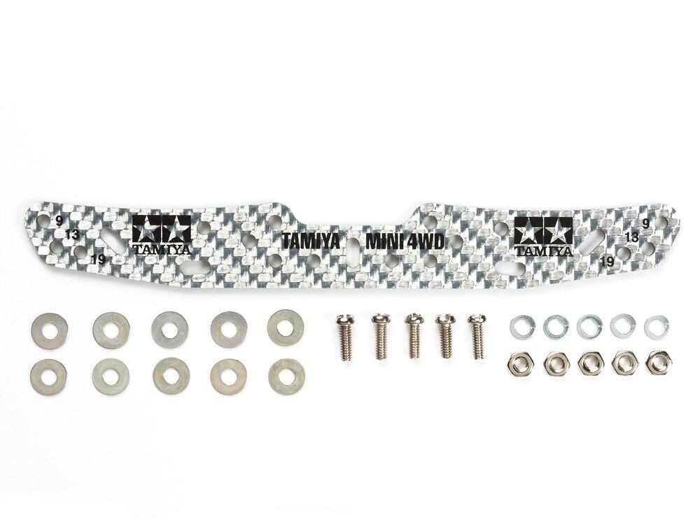 ●9mm、 13mm、 19mmのベアリングローラーをワイドにセットできる1.5mm厚のカーボン製プレートです。 ●FPRプレートに比べて強度が高く、カーボン模様がマシンのレーシングイメージを演出します。※印刷が取れるため、クリーナー等は使わないでください。