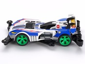 【 フロントモーターレイアウトのFM-Aシャーシを採用 】 シャーシはエアロデザインを取り入れたフロントモーターレイアウトのFM-Aを採用しました。重心が車体のフロントよりにあるのでアップダウンが多いコースでも安定感のある走りが可能。フロント下部に低摩擦樹脂製のスキッドバーを標準装備したのをはじめ、4個のローラーも低摩擦樹脂製。特にリヤローラーは安定性を高めた8mm厚タイプとしました。さらに、モーターはシャーシ底面から簡単に交換でき、セッティング変更もスピーディー。飛行機の翼の断面形状をヒントに作られたエアロサイドステーには様々なパーツが取り付けられます。シャーシ本体はABS樹脂製、アンダーパネルやスキッドバーなどのAパーツはブラックの低摩擦樹脂製。蛍光グリーンが鮮やかなAスポークホイールには、小径ローハイトタイヤを装着しました。3.5:1の超速ギヤ、モーターつき。