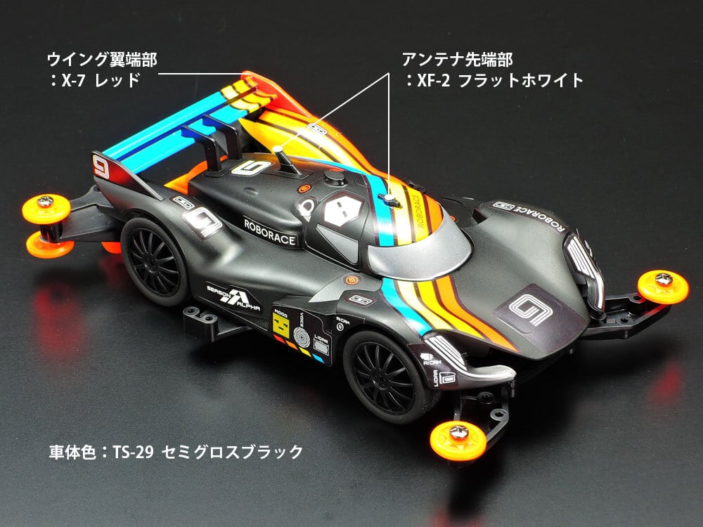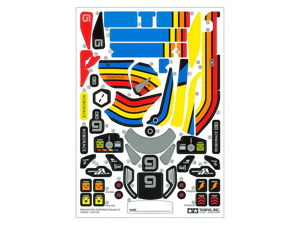 【 最先端のモータースポーツをミニ四駆で体感 】 高性能な走りでレースも楽しい四輪駆動レーサーのプラスチックモデル組み立てキットです。デボット2.0は、AI(人工知能)を搭載した自動運転車によるモータースポーツ、“ROBORACE”で活躍するマシン。特徴的なフロントフェイスや、プロトタイプレーシングカーをベースにしたなめらかなボディスタイルが目を引く最先端のレース車両を、ミニ四駆で実感たっぷりにモデル化しました。また、シャーシは組み立てやすく高性能なMAを採用。ABS樹脂製の本体はダイナミックなボディ形状がいっそう引き立つブラックカラー、低摩擦樹脂製のAパーツはポップな蛍光オレンジとしてアクセントをつけました。そして、フィンスポークホイールには小径ローハイトタイヤを装着。足まわりもブラックでまとめて、実車のシックなイメージが伝わる仕上がりです。ボディに走るカラフルなストライプや、サイドのディスプレイなどは伸びの良いビニール素材のステッカーで表現しました。