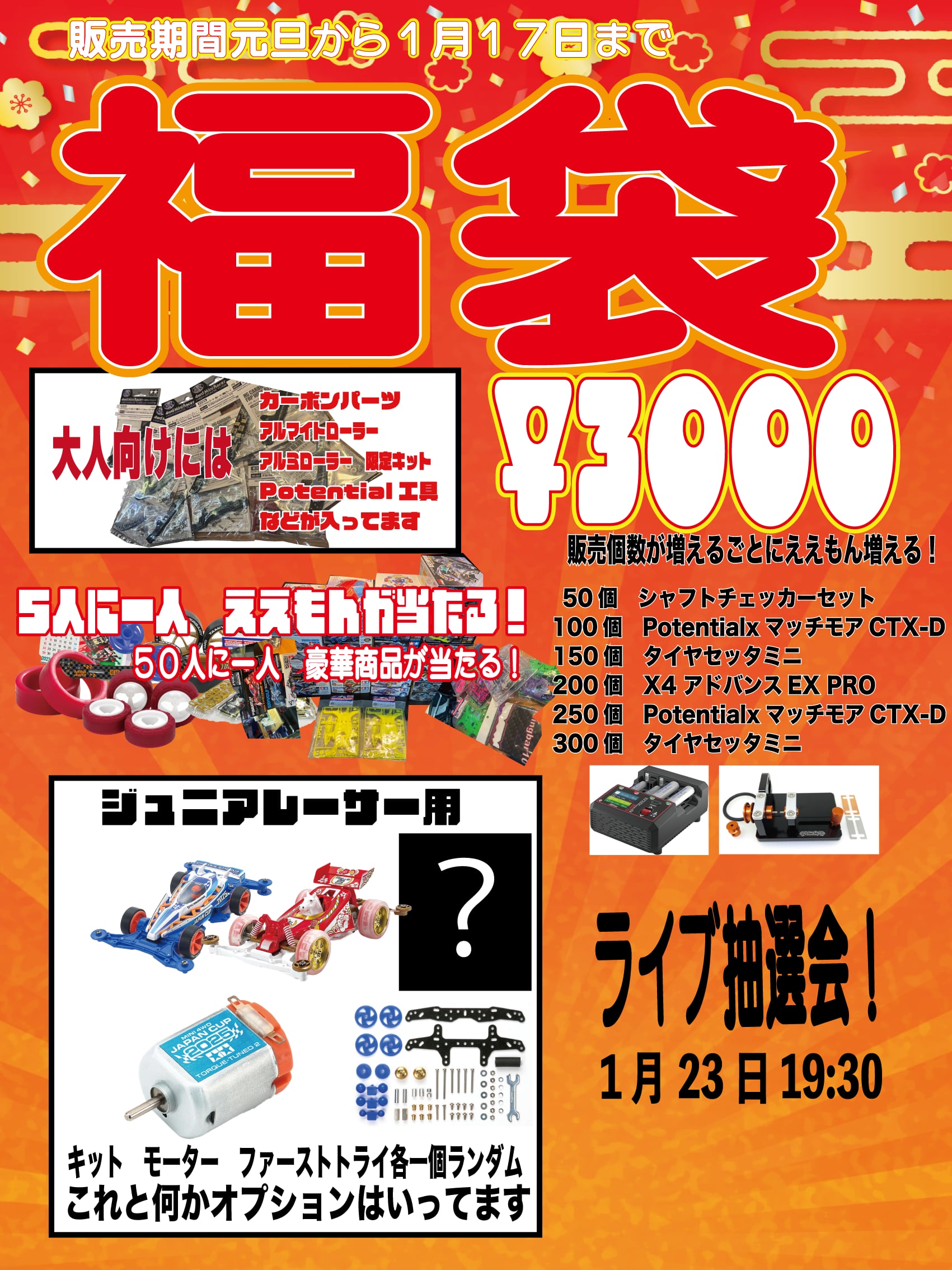 福袋には3000円分以上のミニ四駆に使えるアイテムが入ってます。