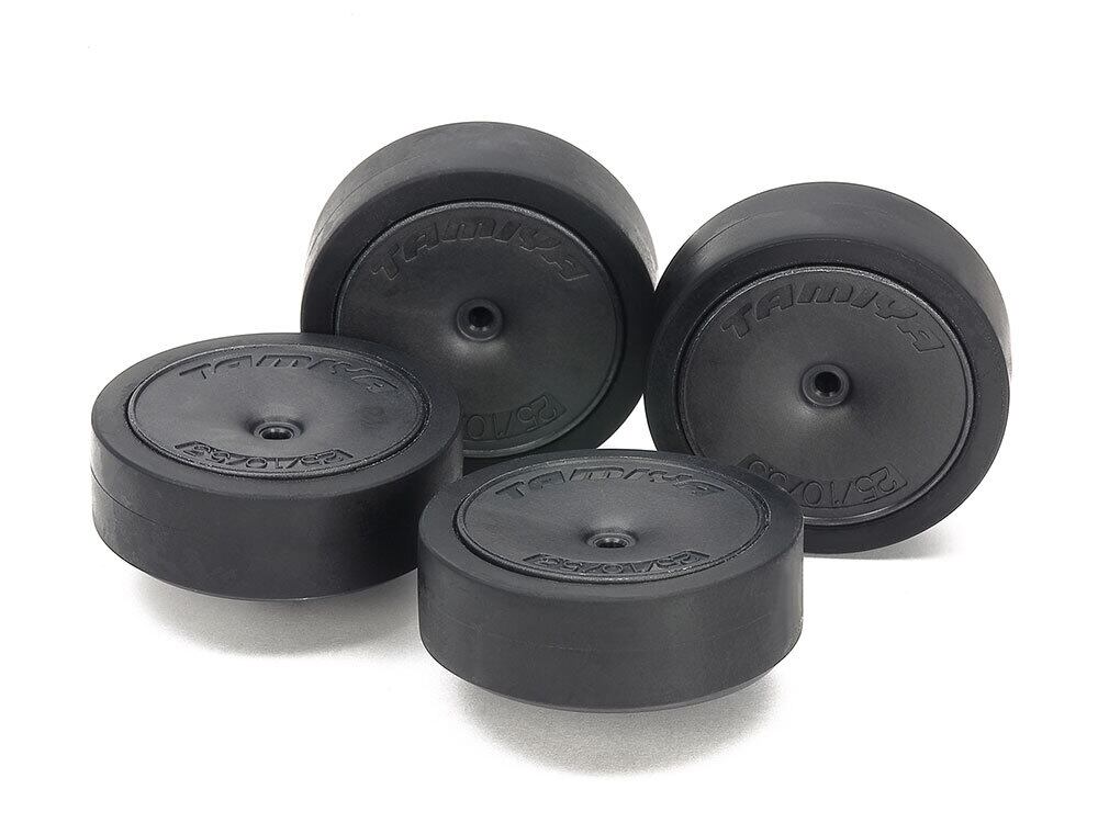 【 マシンの性能アップやセッティングに役立つパーツです 】 ディッシュデザインのカーボン強化ホイールと、ローフリクション大径ローハイトタイヤ(31mm)を4本ずつ、1台分セットしました。カーボンファイバー配合樹脂製のホイールは強度が高く、跳ねにくさも特徴。タイヤはキット標準タイプに比べて硬くローグリップのため、スムーズなコーナリングを生み出し、ジャンプ時の飛距離を短くして走行安定性も向上します。カラーはタイヤ、ホイールともに精悍なブラック。大径タイヤを装着したミニ四駆PRO、ミニ四駆各車に使えます。